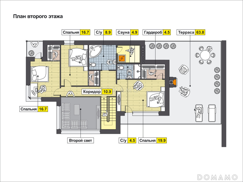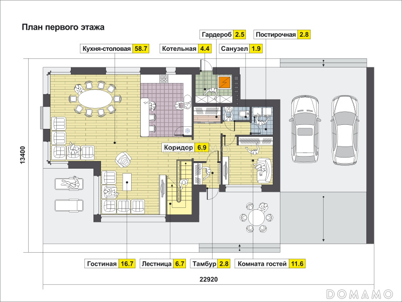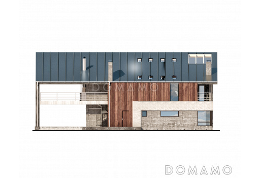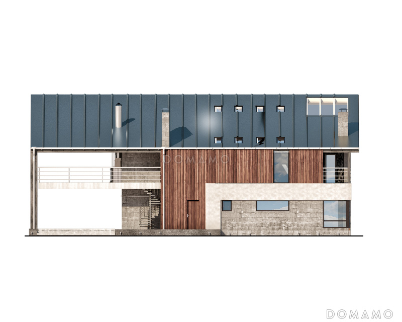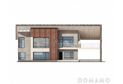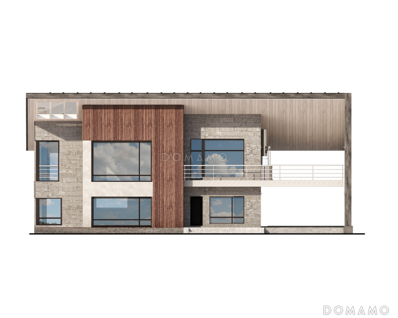 Проект современного дома с навесом на два автомобиля, большой террасой с барбекю, вторым светом, сауной