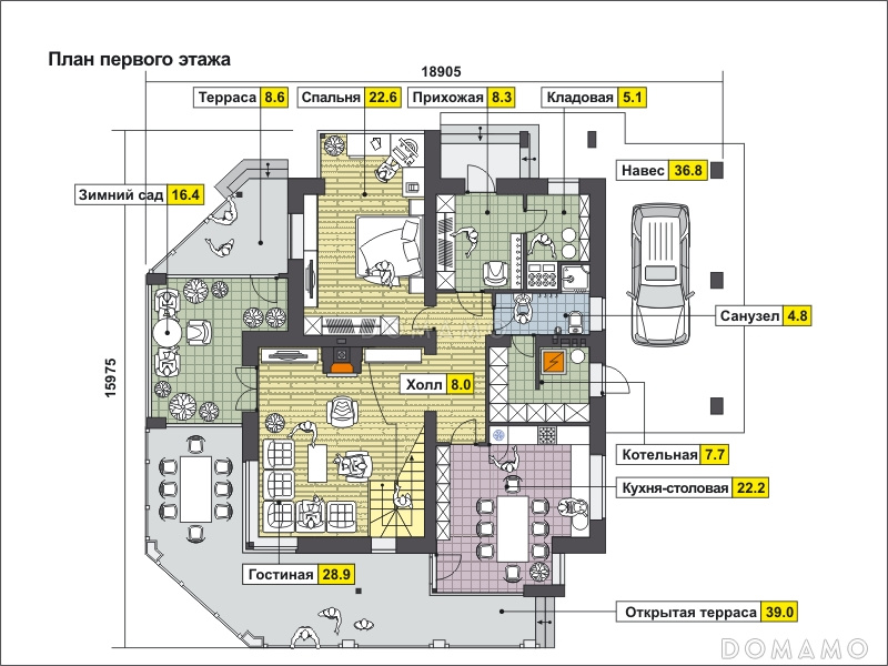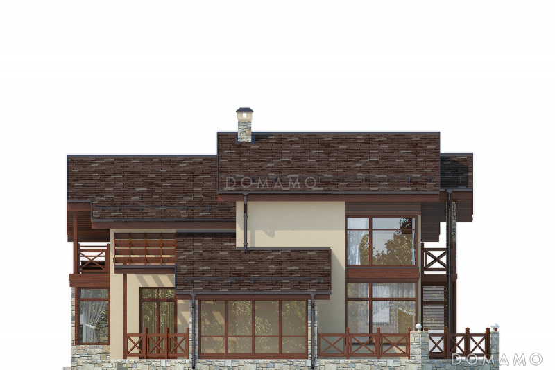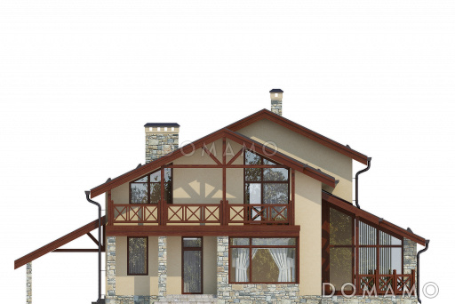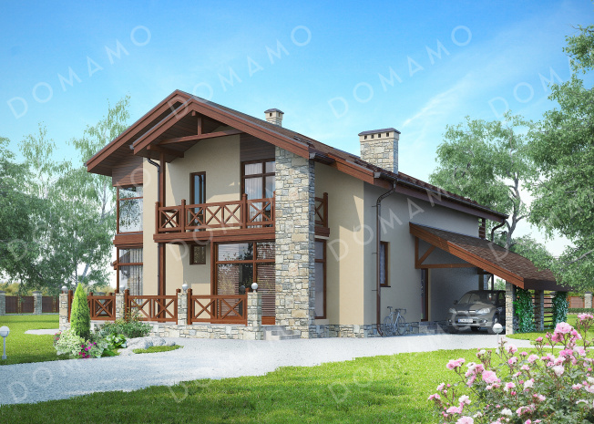 Проект дома с большой открытой террасой, навесом на одну машину, вторым светом, террасой и балконом на мансардном этаже