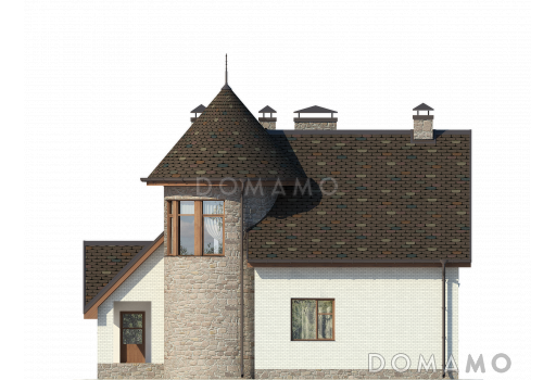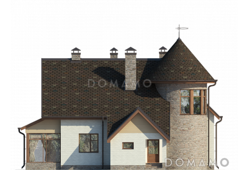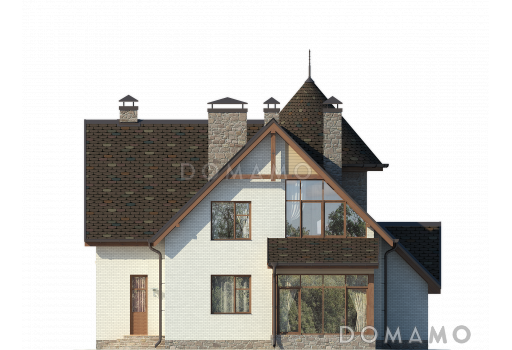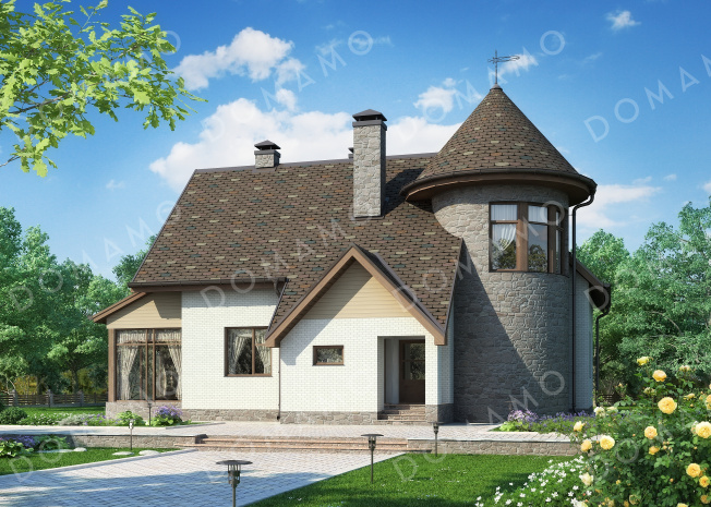 Дом D162 Проект дома с застекленным холлом, полукруглым крыльцом, сауной и четырьмя спальнями на мансарде