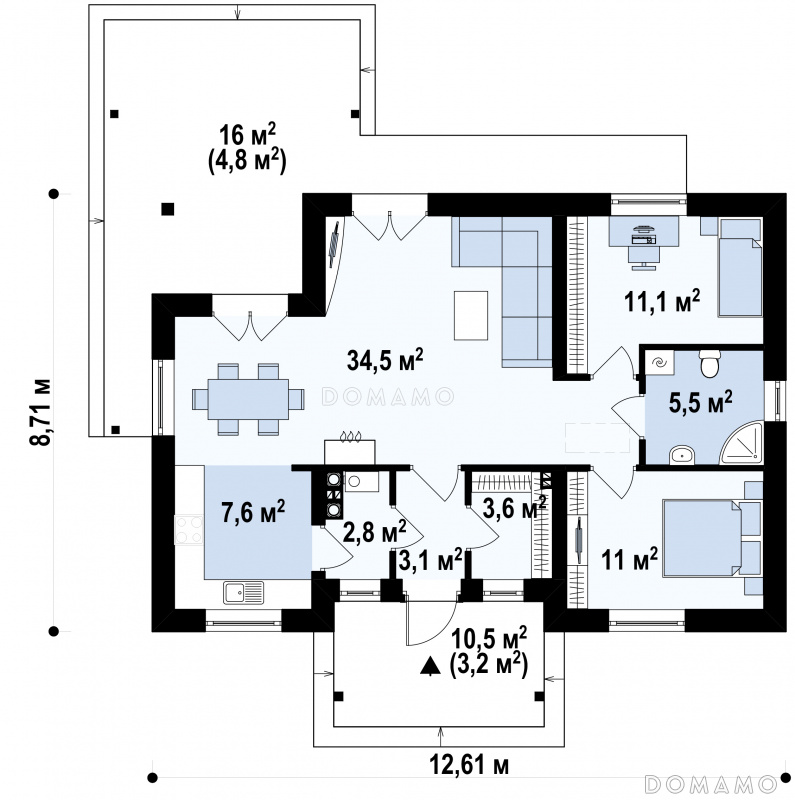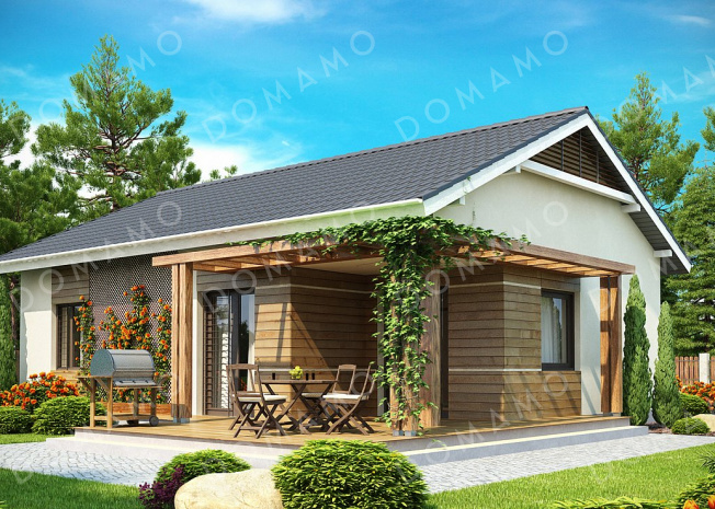 Дом D2220 Проект компактного одноэтажного дома из кирпича с двумя спальнями и частично крытой угловой террасой, с возможностью обустроить мансарду