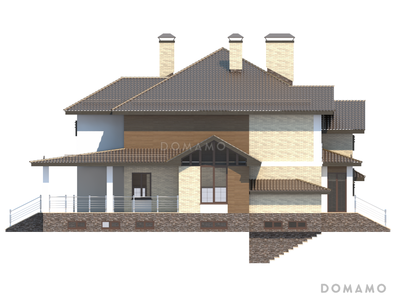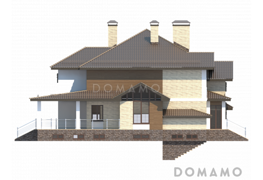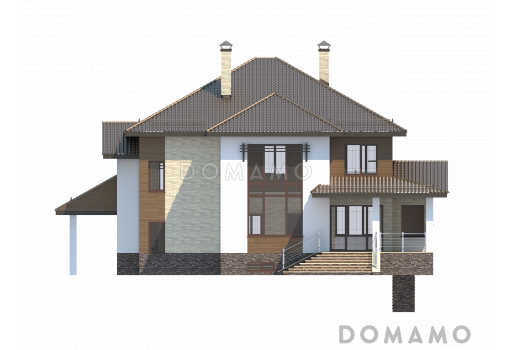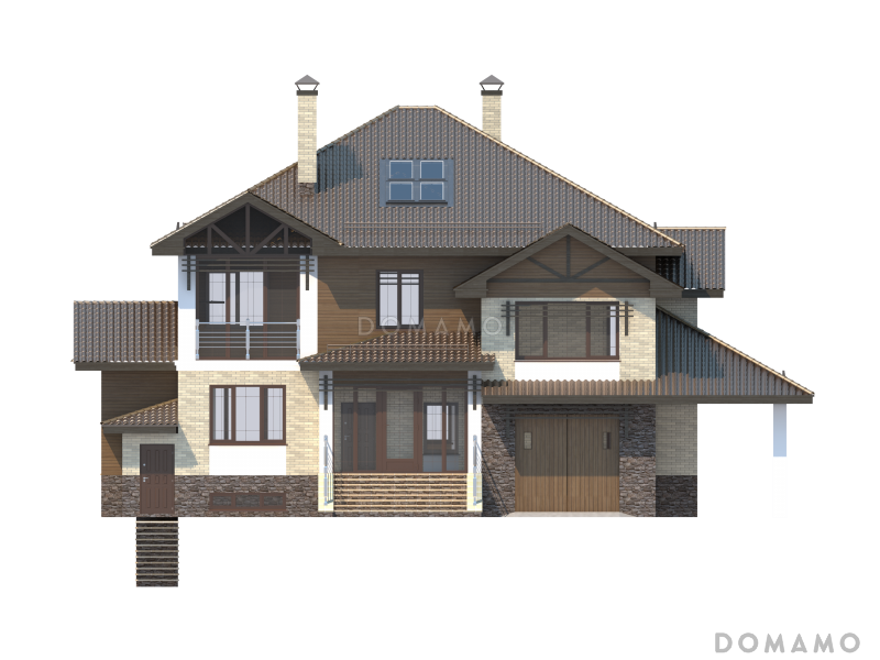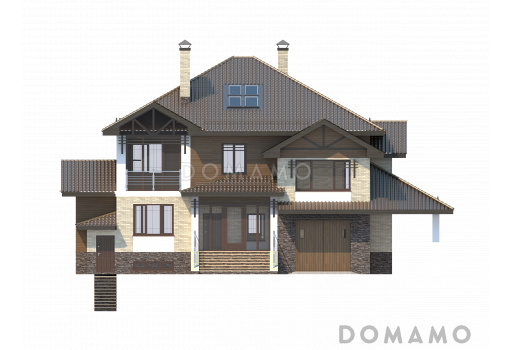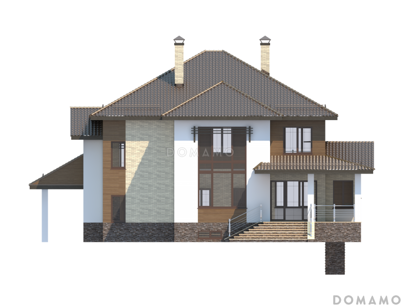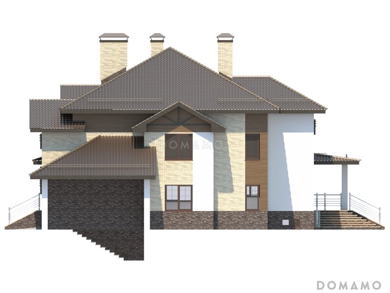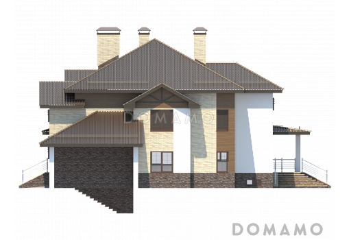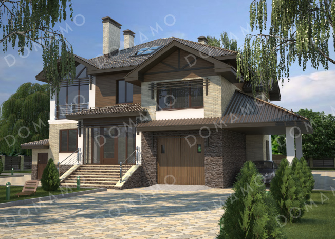 Дом D2729 Проект особняка в трех уровнях, с комнатой отдыха на чердаке, с мастерской, гаражом и навесом под автомобиль