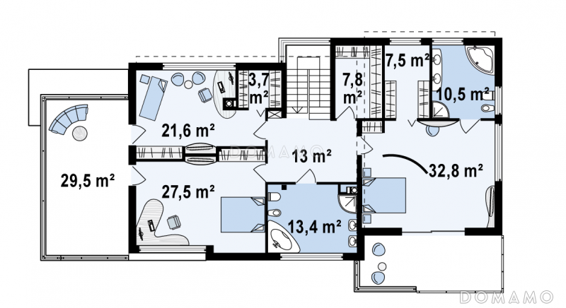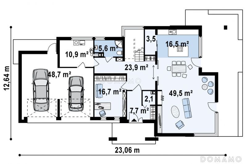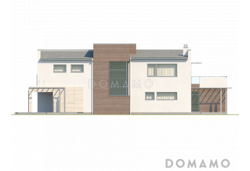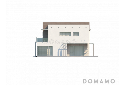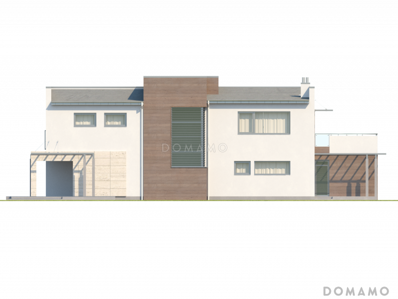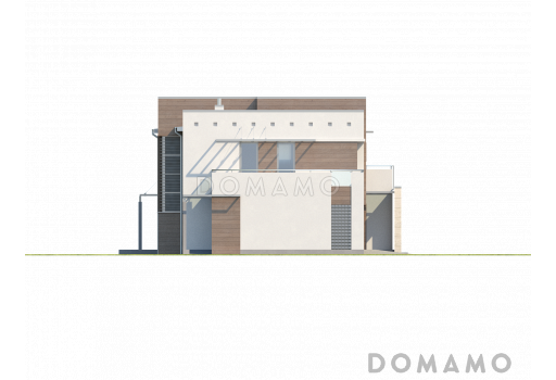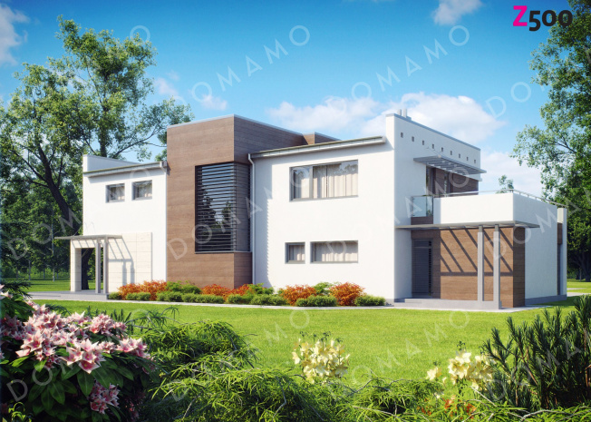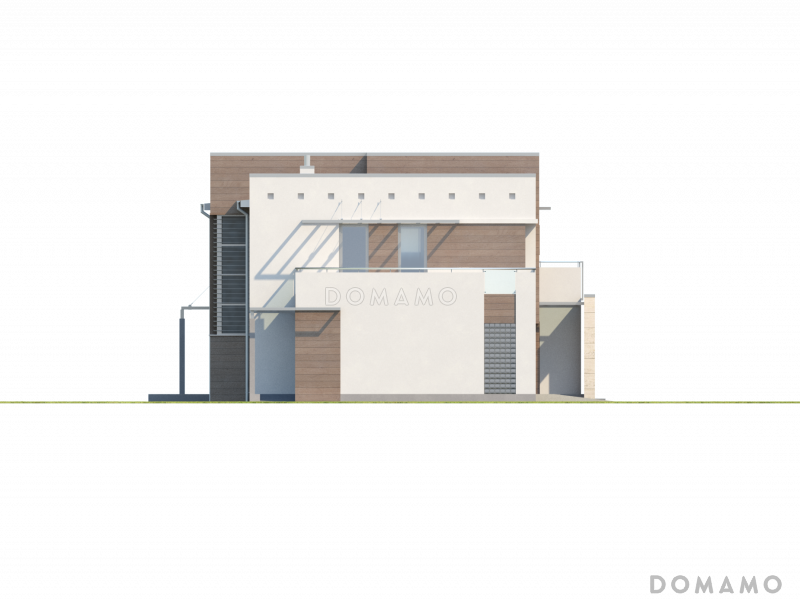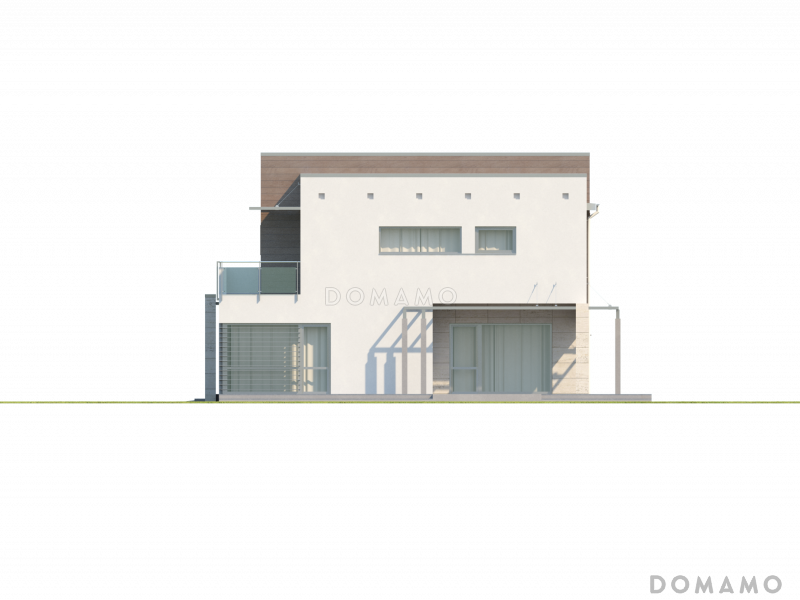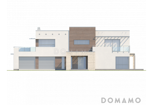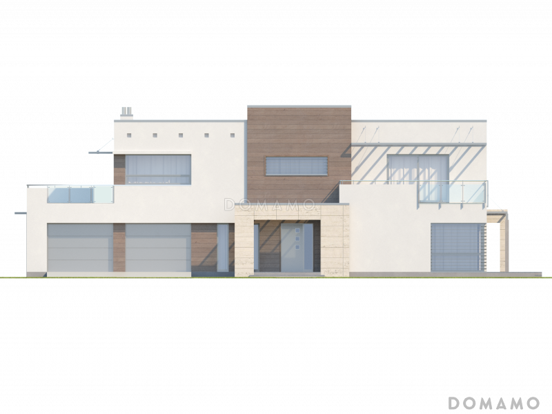 Дом D3084 Проект современного двухэтажного дома в стиле хай-тек из кирпича с плоской крышей, балконом и гаражом с двумя отдельными въездами