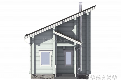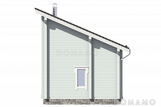 Проект узкого дома с косой крышей, кухней-гостиной, парной, спальней, балконом и вторым светом