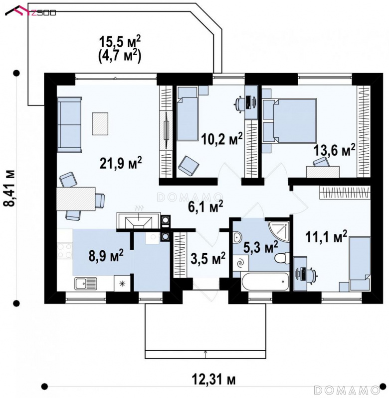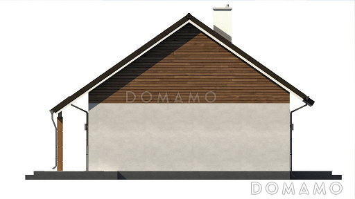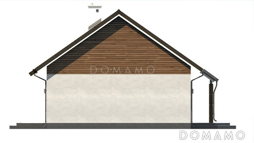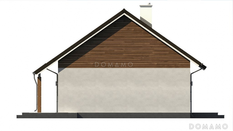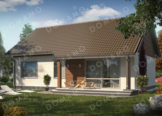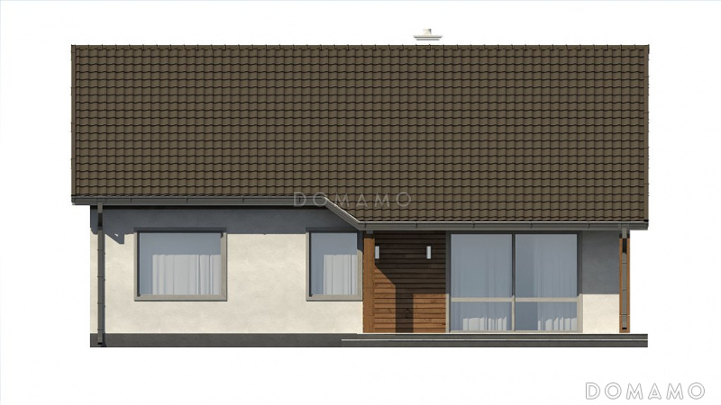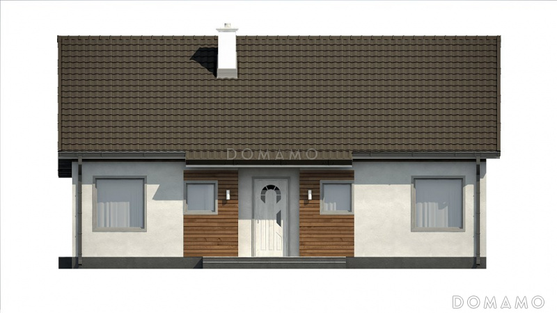 Дом D375 Проект компактного одноэтажного дома из кирпича с острой крышей, с тремя спальнями и небольшой крытой террасой