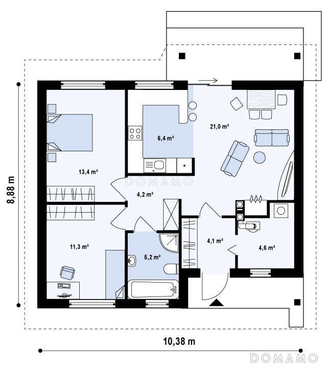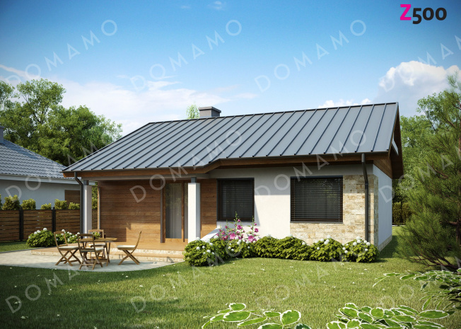 Дом D4079 Проект небольшого одноэтажного дома из кирпича с двумя спальнями и террасой