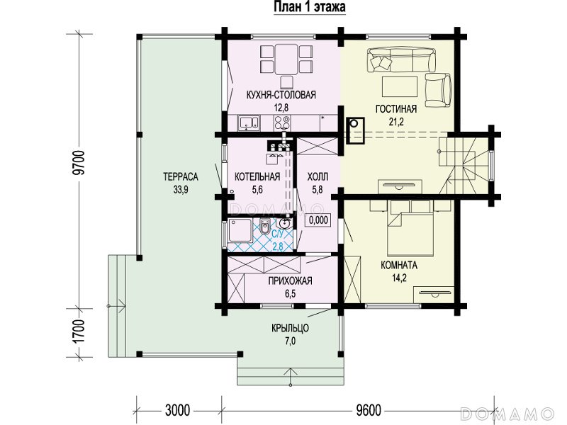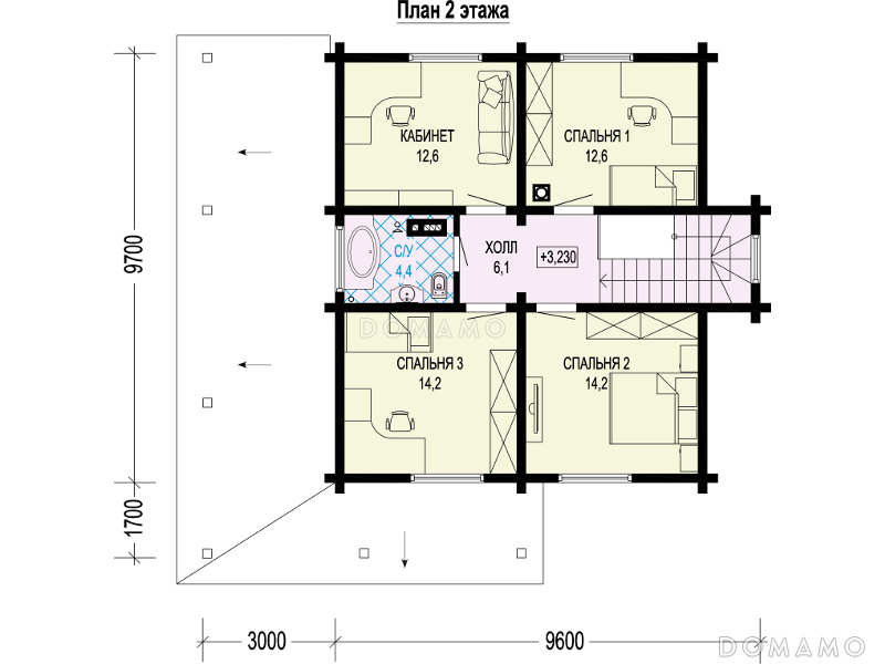 Проект двухэтажного дома из бруса с четырьмя спальнями, кабинетом и крытой террасой