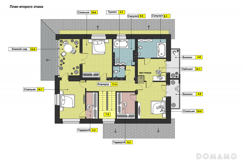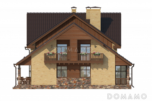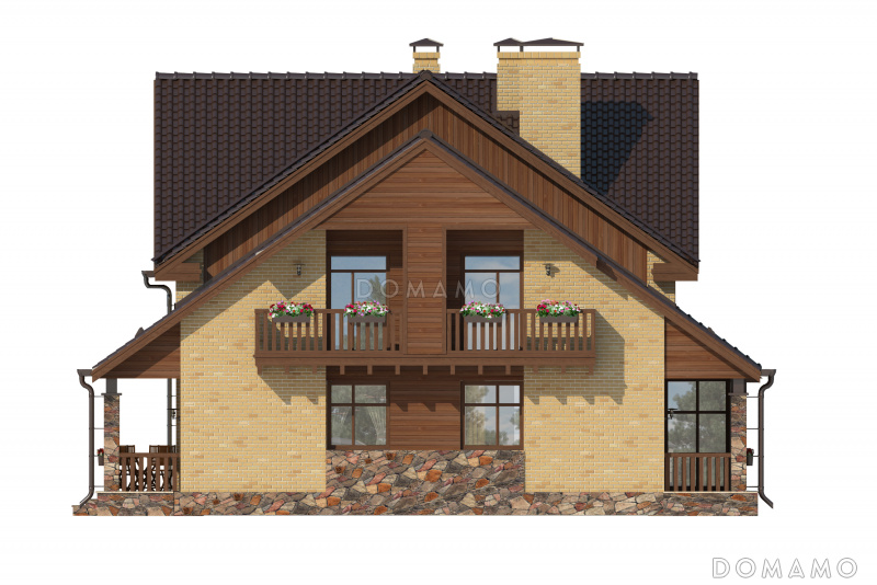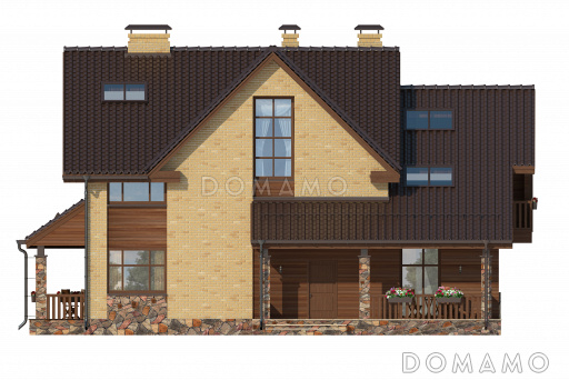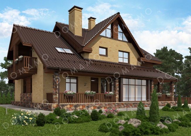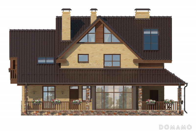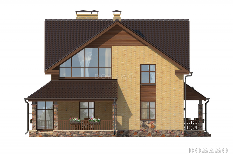 Проект дома с просторной гостиной и кухней столовой, террасой с барбекю, зимним садом, двумя балконами,