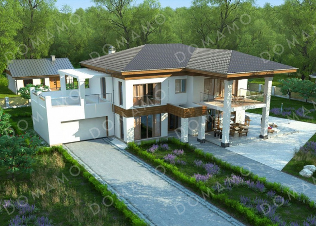 Дом D4721 Проект просторного двухэтажного дома из кирпича с четырьмя комнатами, гаражом и террасами на обоих уровнях