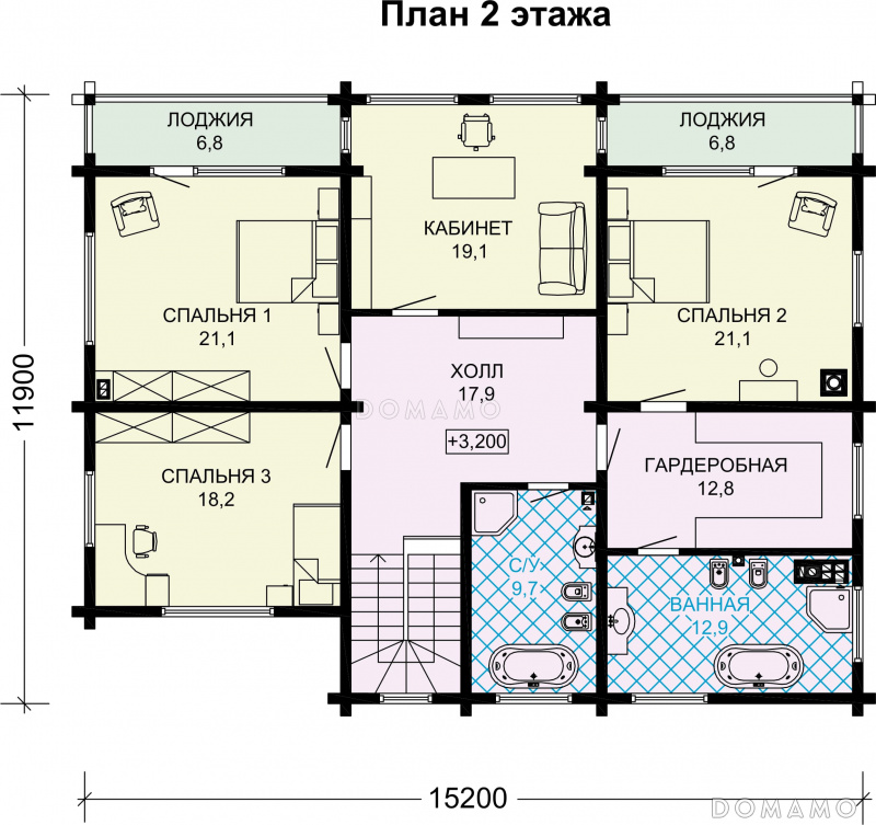 Проект двухэтажного деревянного дома с большой мастер-спальней и двумя лоджиями