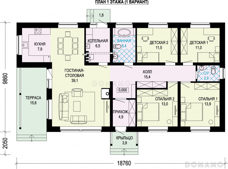 Проект одноэтажного кирпичного дома с четырьмя спальнями