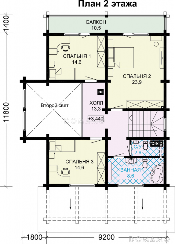 Проект дома из бруса с 4 спальнями, террасой, балконом и вторым светом