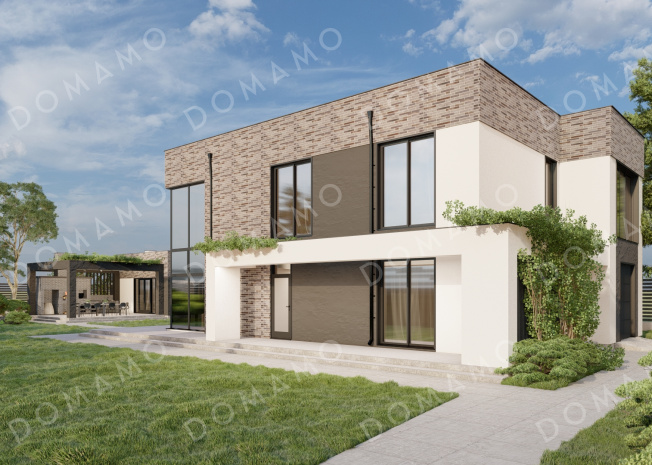 Дом D5622 Проект двухэтажного дома в стиле хай-тек с мастерской-гаражом, очень просторной террасой и вторым светом