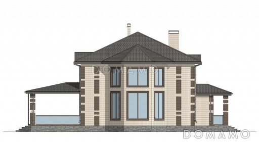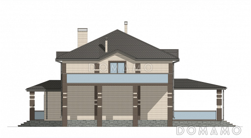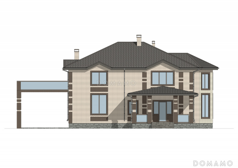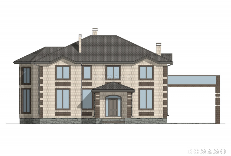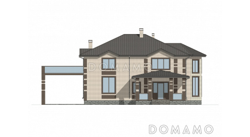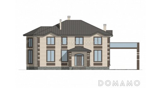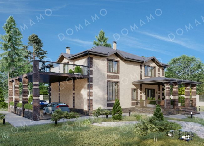 Дом D6454 Проект двухэтажного кирпичного дома со вторым светом, навесом для автомобиля и открытой террасой на втором этаже