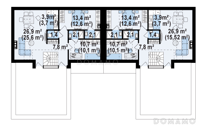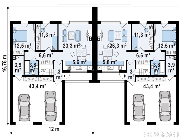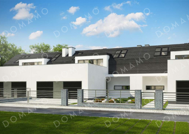 Дом D3661 Проект современных мансардных домов-близнецов из газобетона с большим гаражом, открытой террасой на втором этаже и четырьмя спальнями