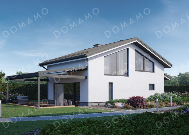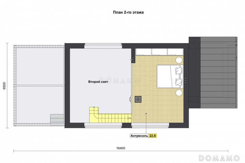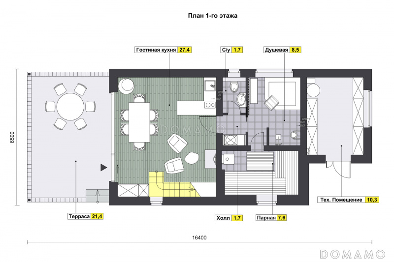 Проект бани с большой кухней-гостиной, террасой и комнатой на антресоли