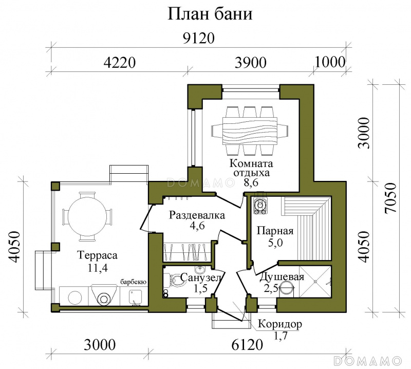Баня D5855 План кирпичной бани с барбекю в средневековом английском стиле
