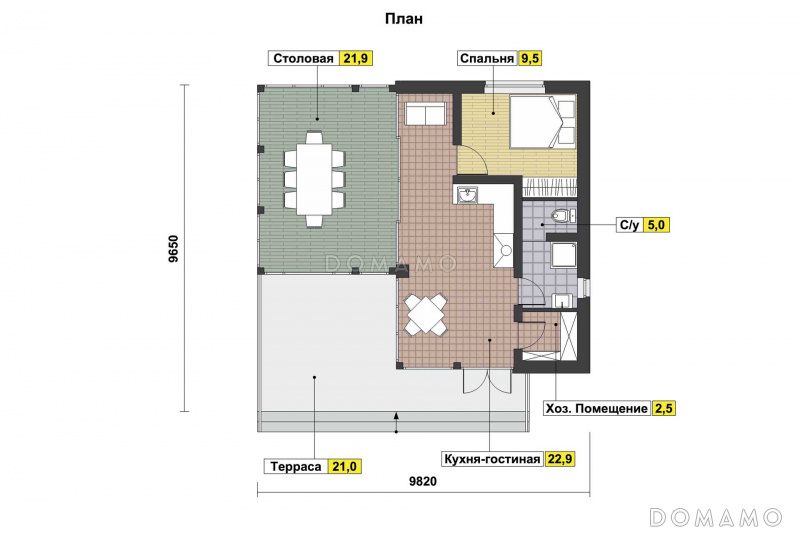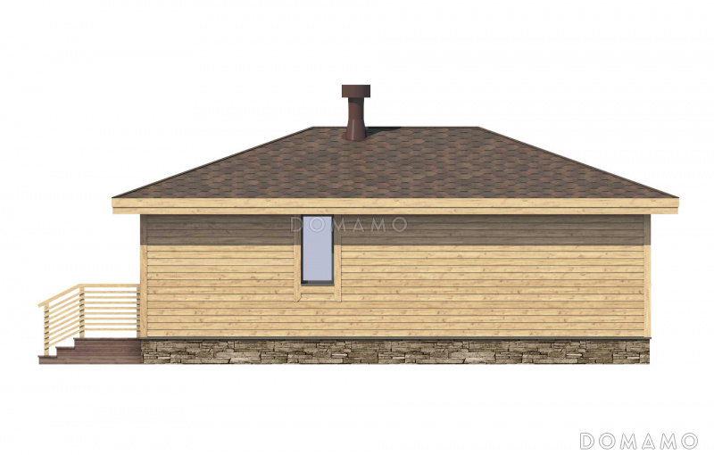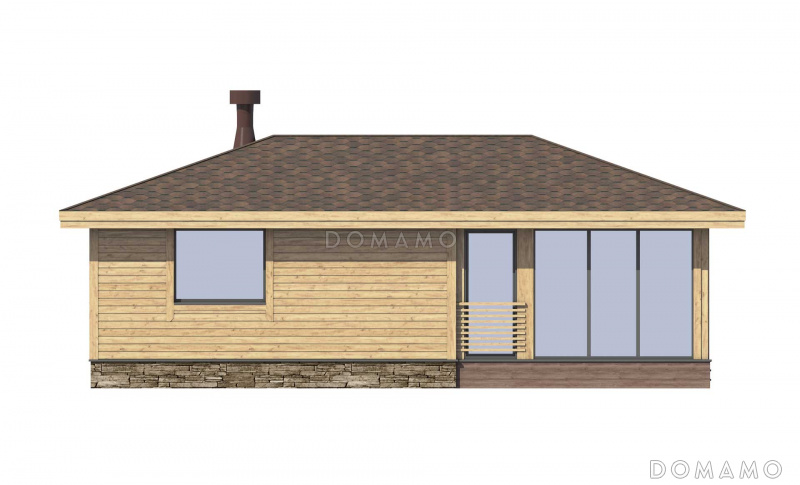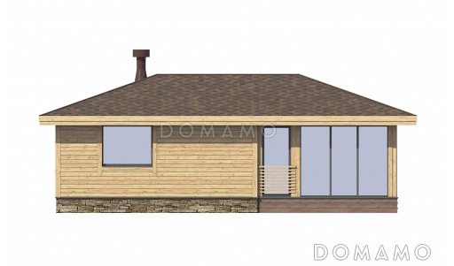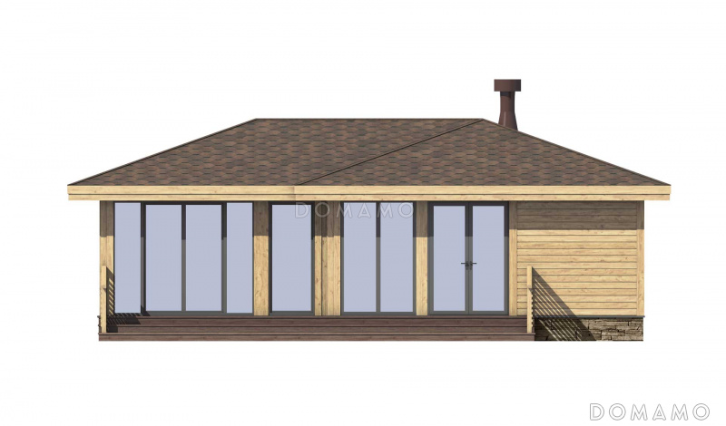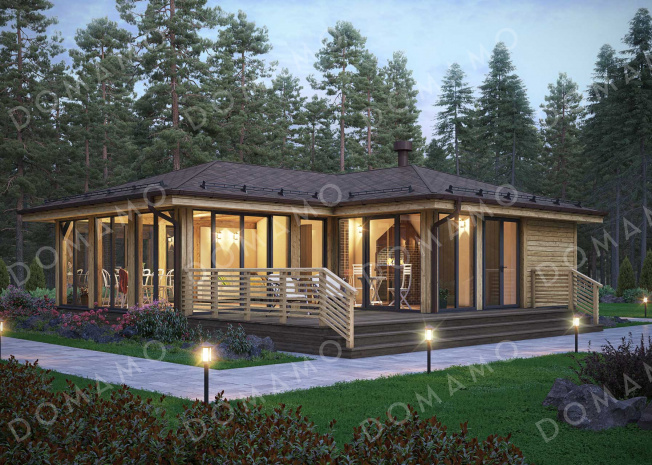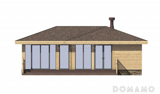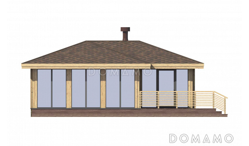 Дом D3313 Проект беседки с панорамным остеклением, открытой террасой, столовой, санузлом, кладовой, кухней-гостиной и спальней